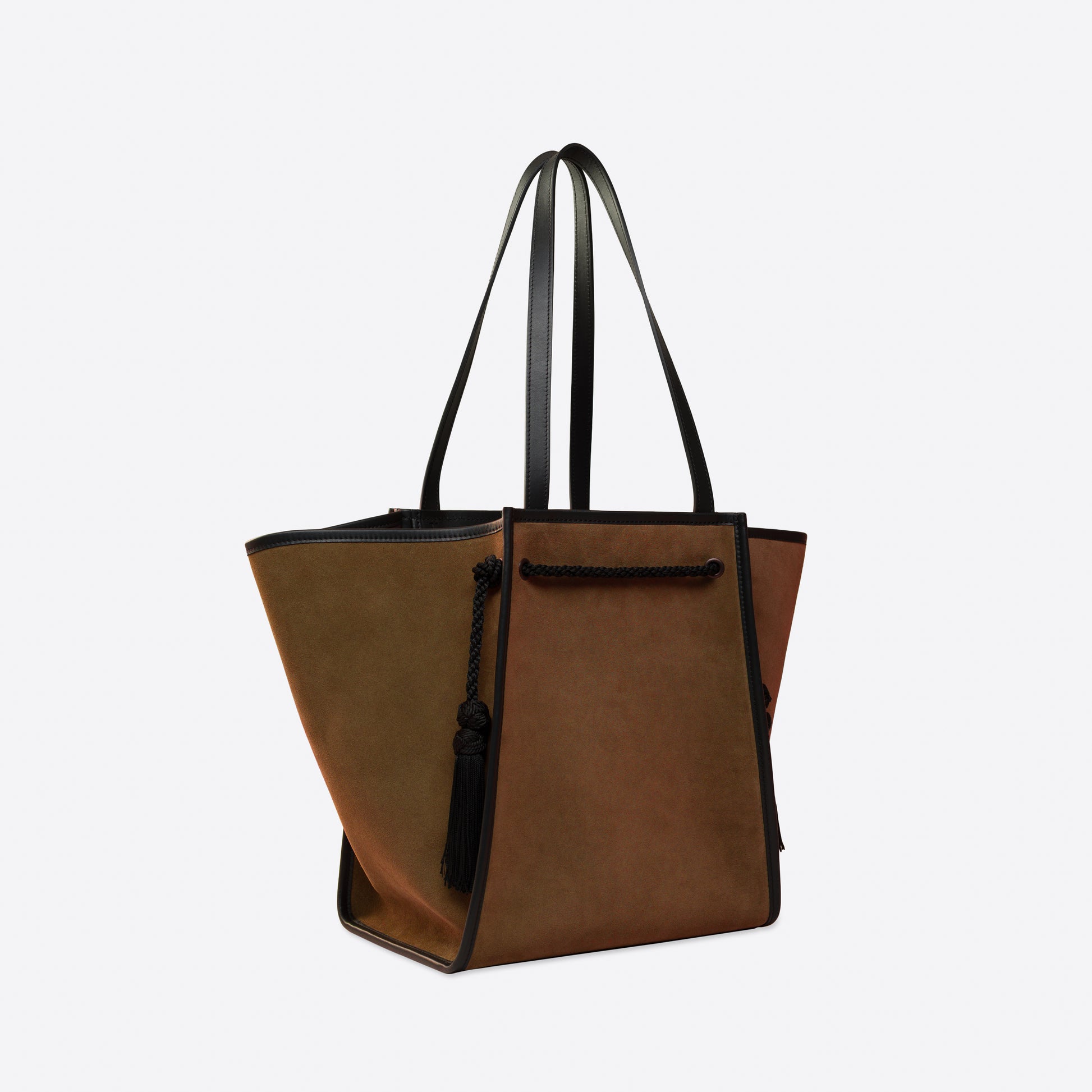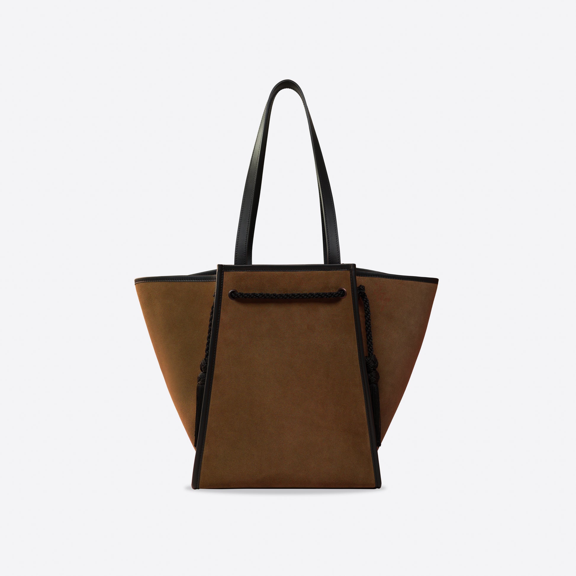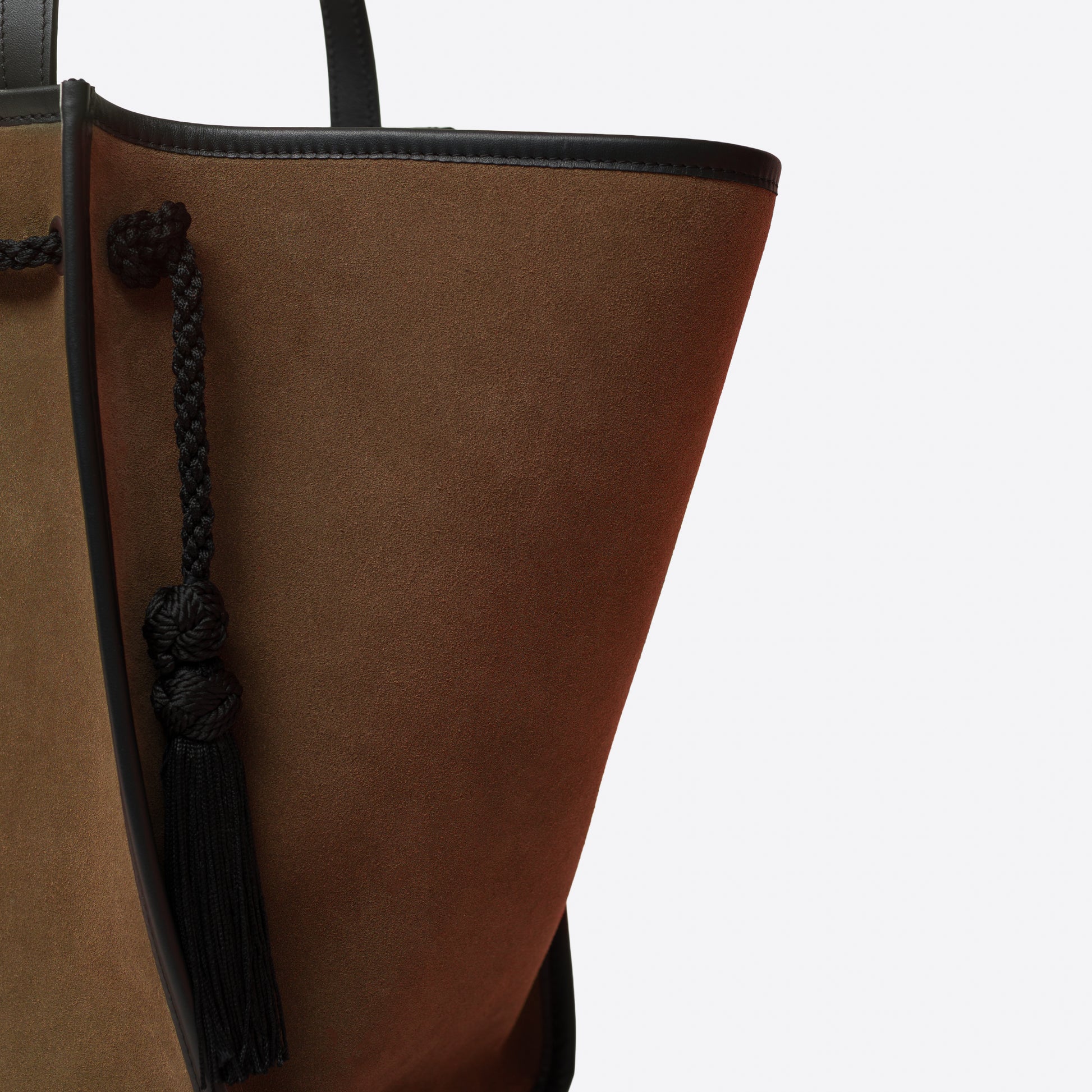 - Extérieur : Cuir velours marron, avec fond et poignées en cuir lisse noir. Garnitures en passementerie et pompons noirs.