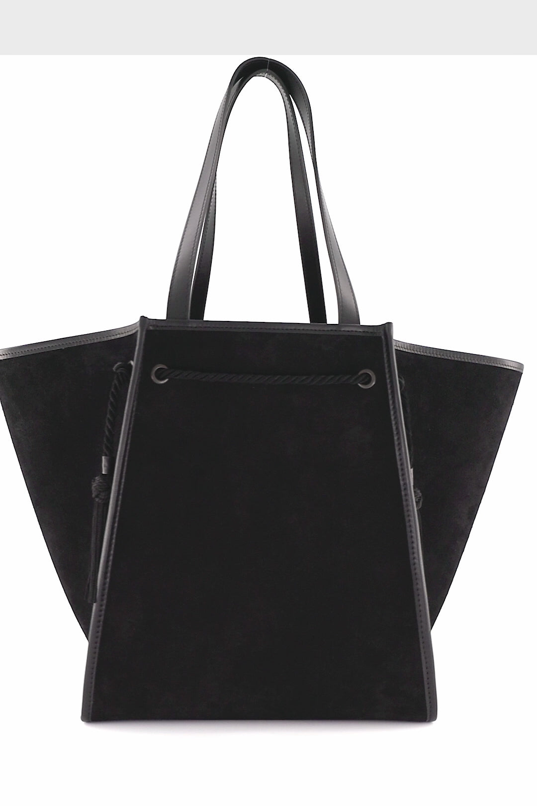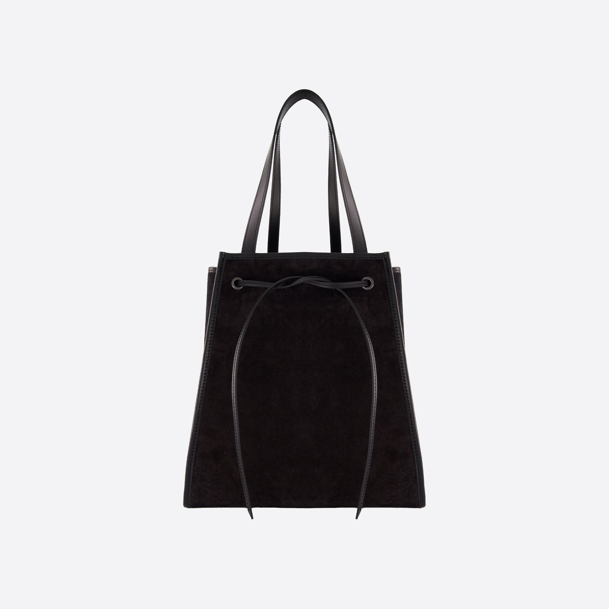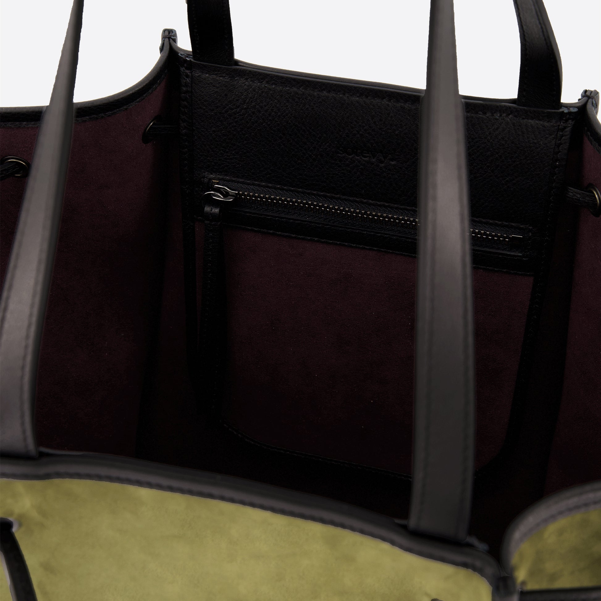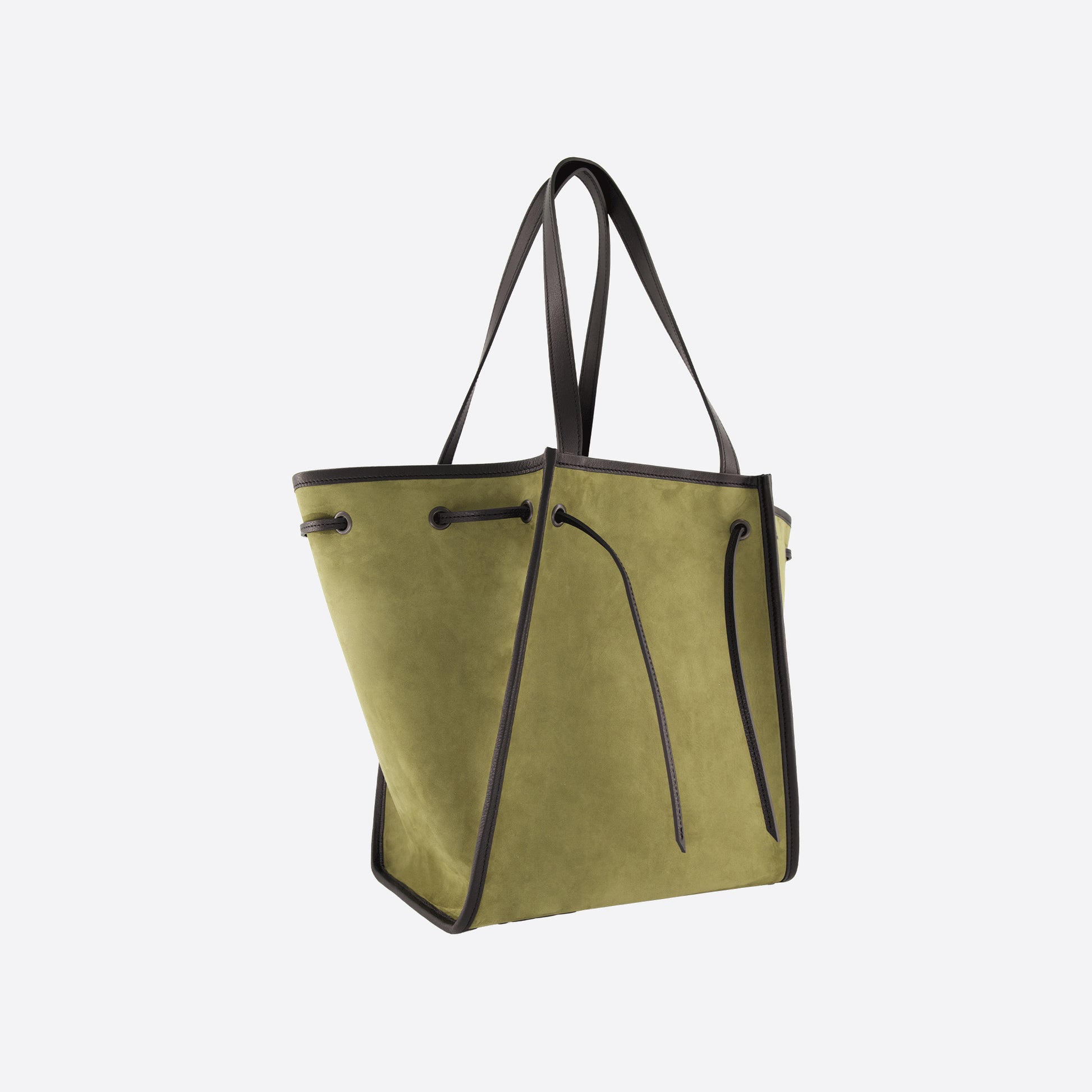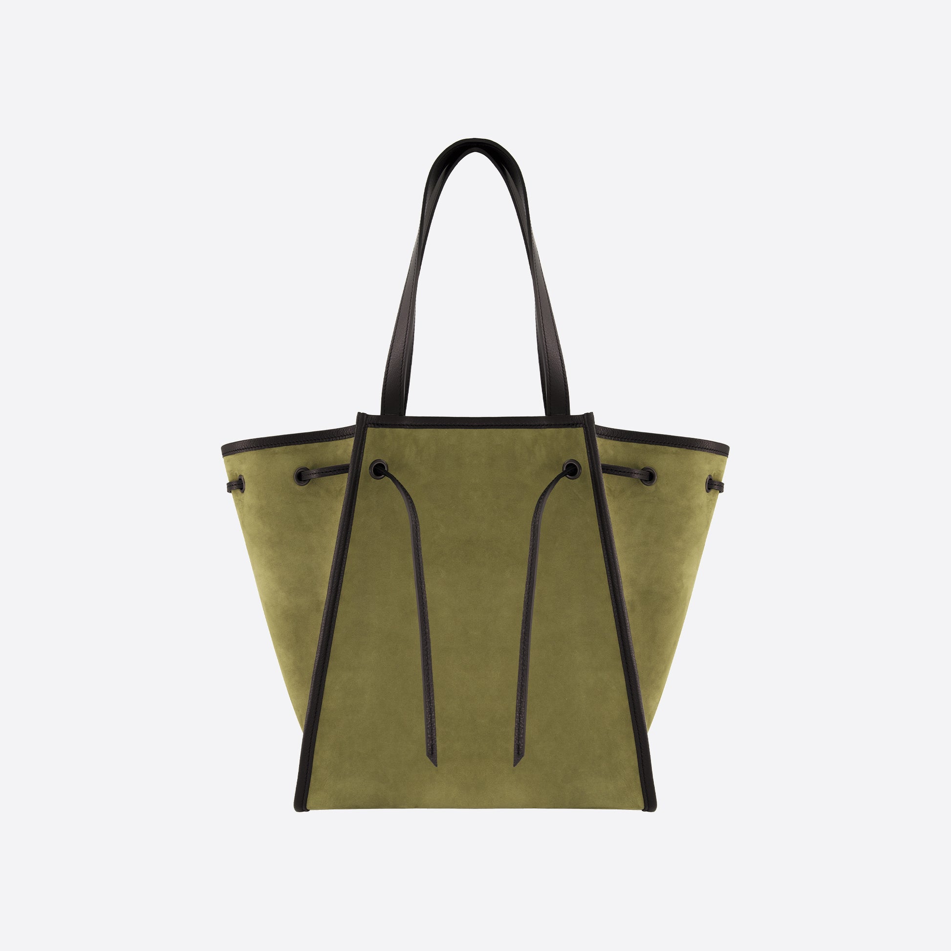 Crafted from high-quality khaki suede, the bag is adorned with sleek, smooth leather accents. The leather tie allows you to adjust the bag, transforming it from a classic tote to a stylish bucket bag in an instant.