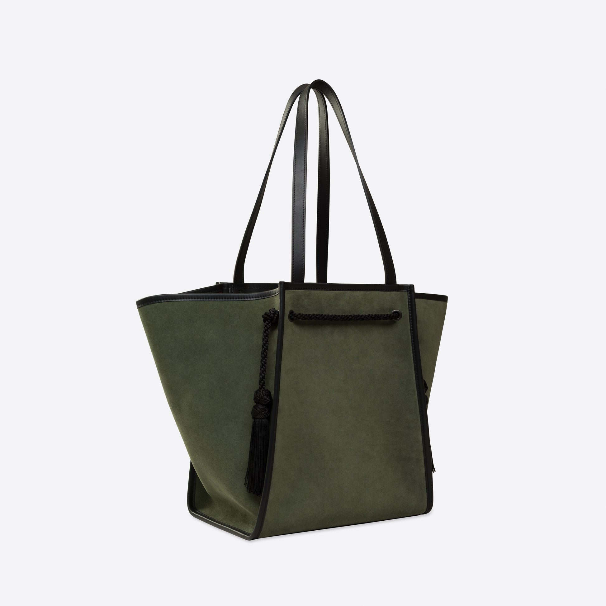 A timeless blend of elegance and practicality, the Lydia tote bag in khaki suede is designed to elevate your everyday style. Its smooth leather accents and sophisticated decorative trim are complemented by two graceful tassels, adding a subtle touch of luxury.