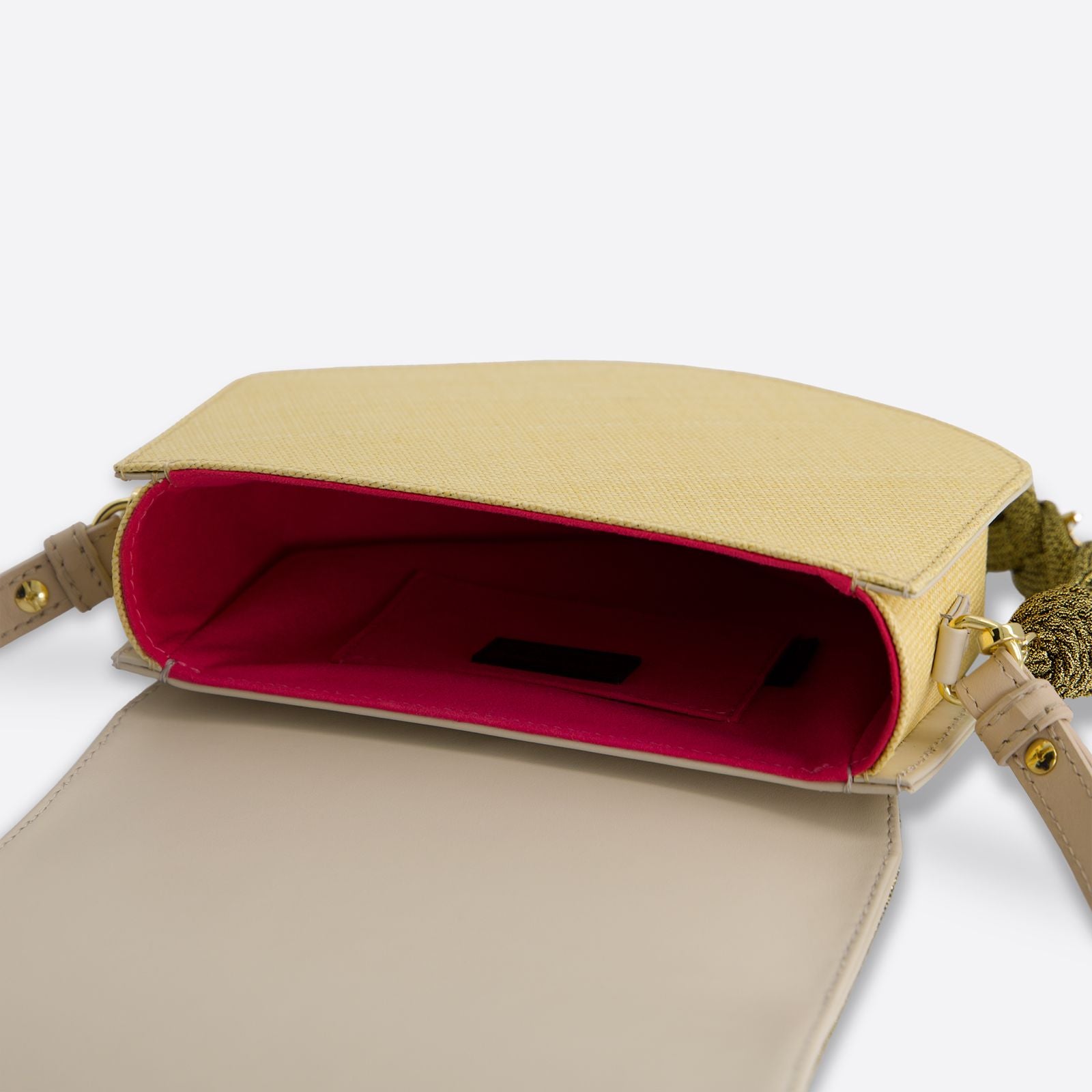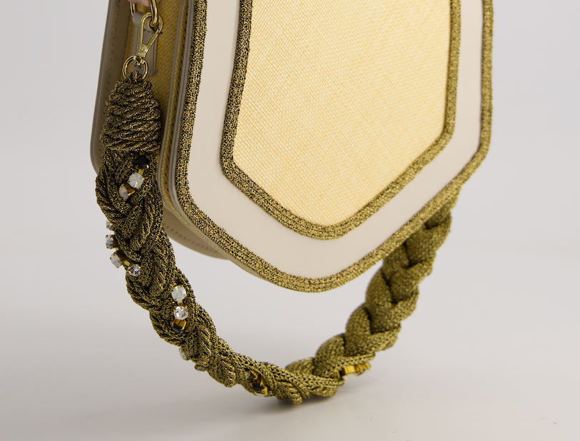 - Outside: Ivory leather and raffia. Hand-braided gold passementerie handle.