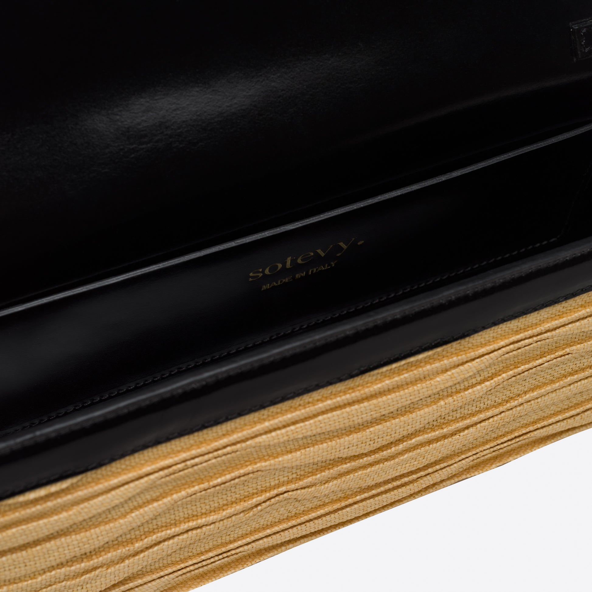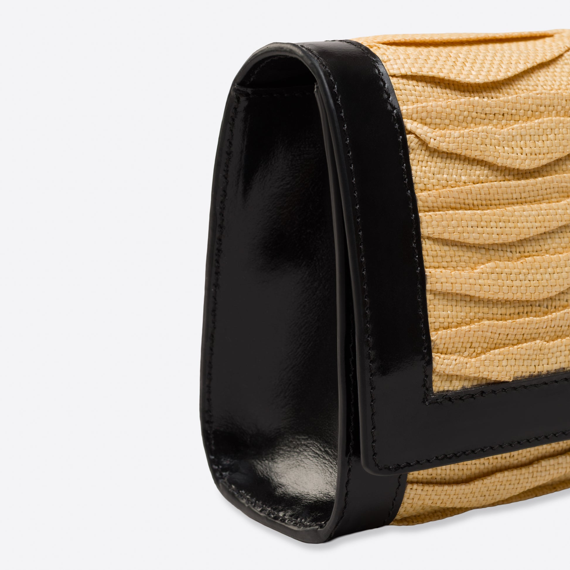 - Outside: Pleated raffia and black patent leather.