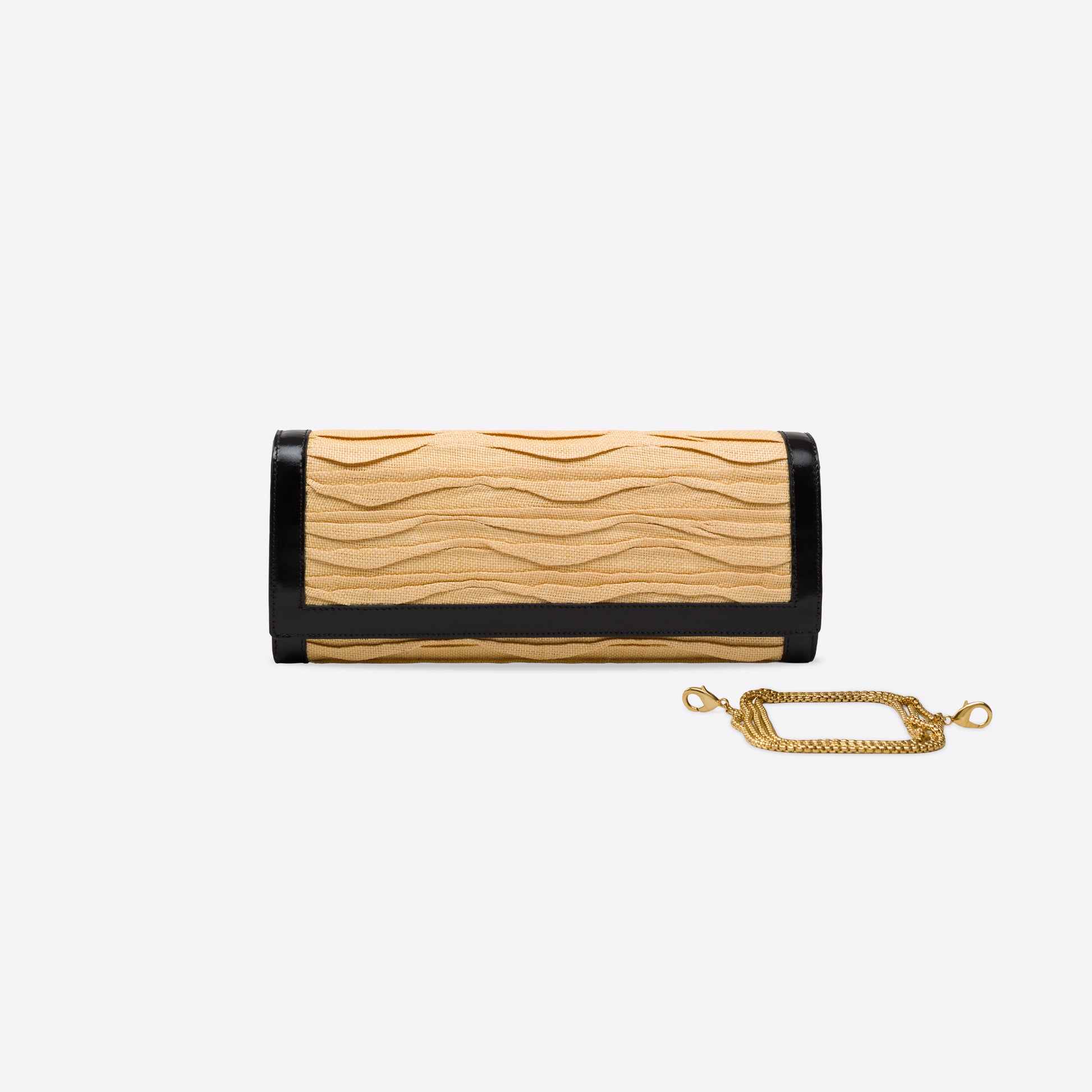 Like a soft breeze caressing sunlit shores, the Alba clutch melds leather with pleated raffia, reflecting the undulations of the waves and the fine texture of sand, making it a piece that captures the spirit of an endless summer.