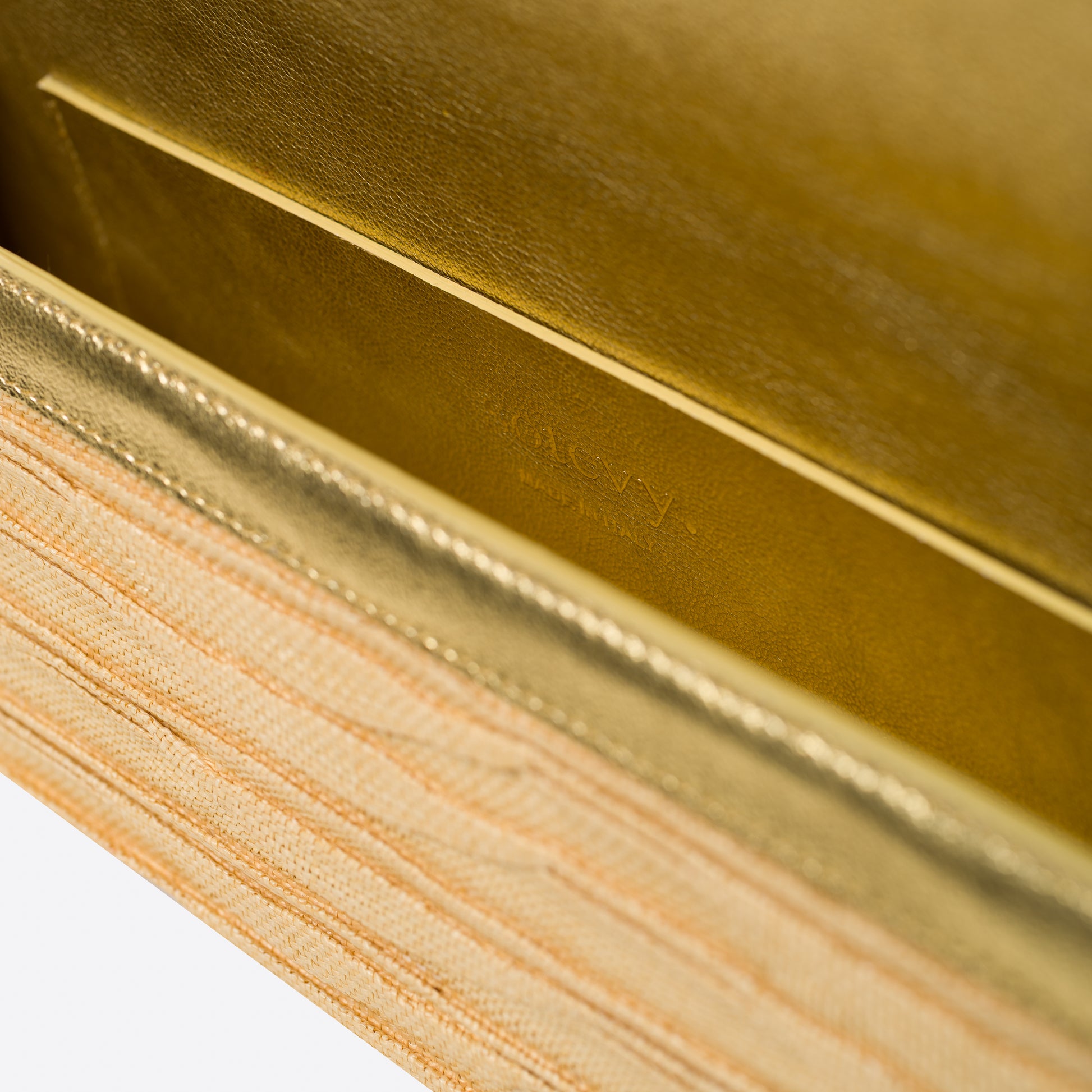 - Outside: Pleated raffia and gold leather.