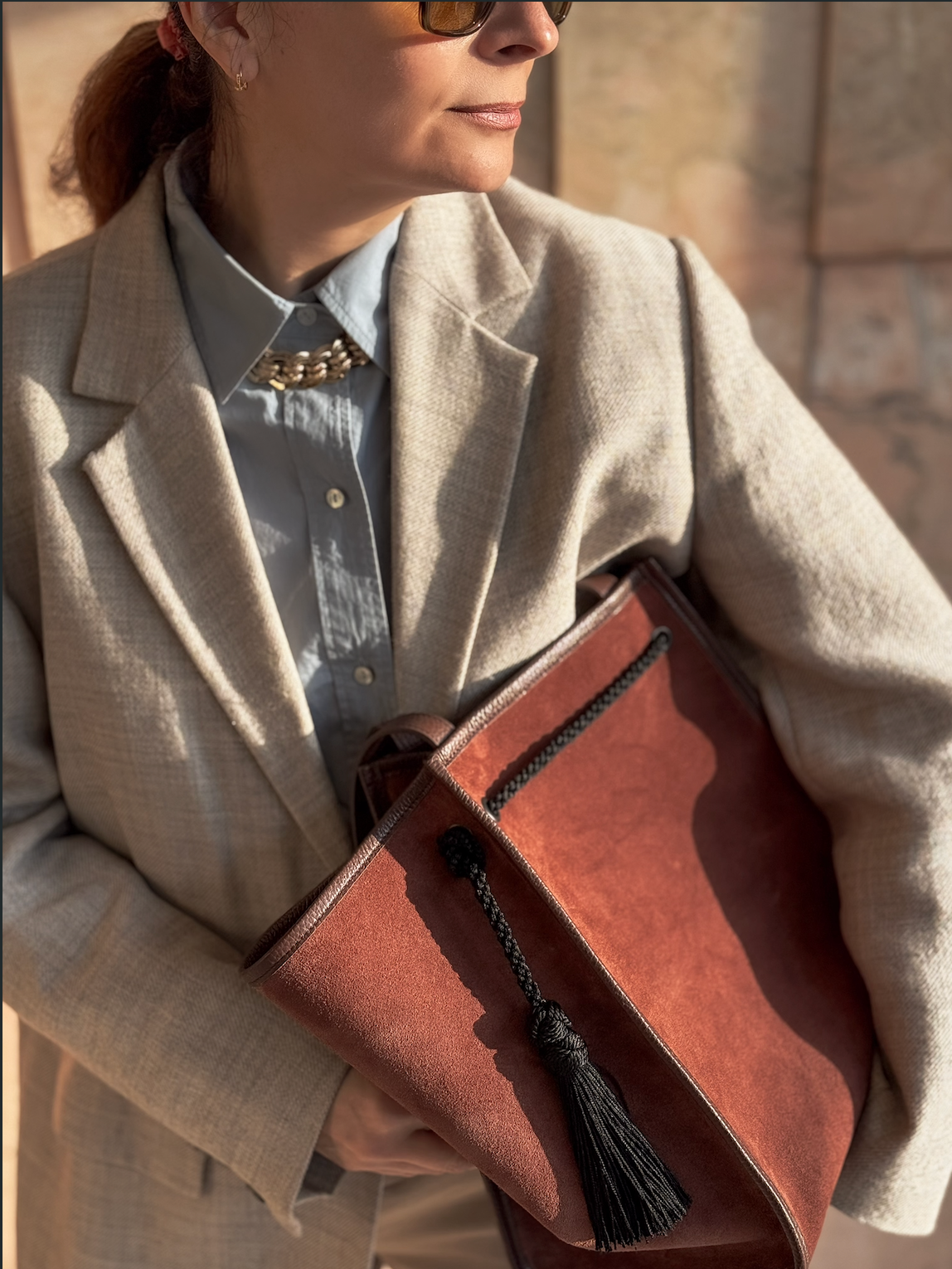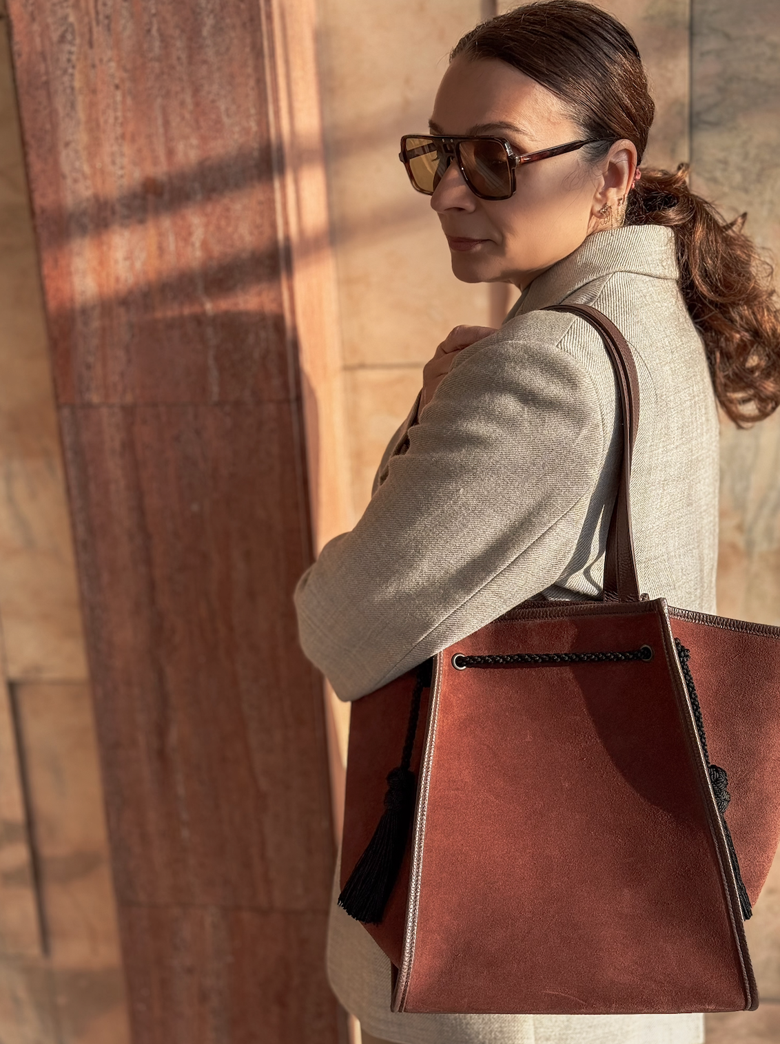 - Outside: Muscat suede, with brown grained leather bottom and handles. Black trim and tassels.
